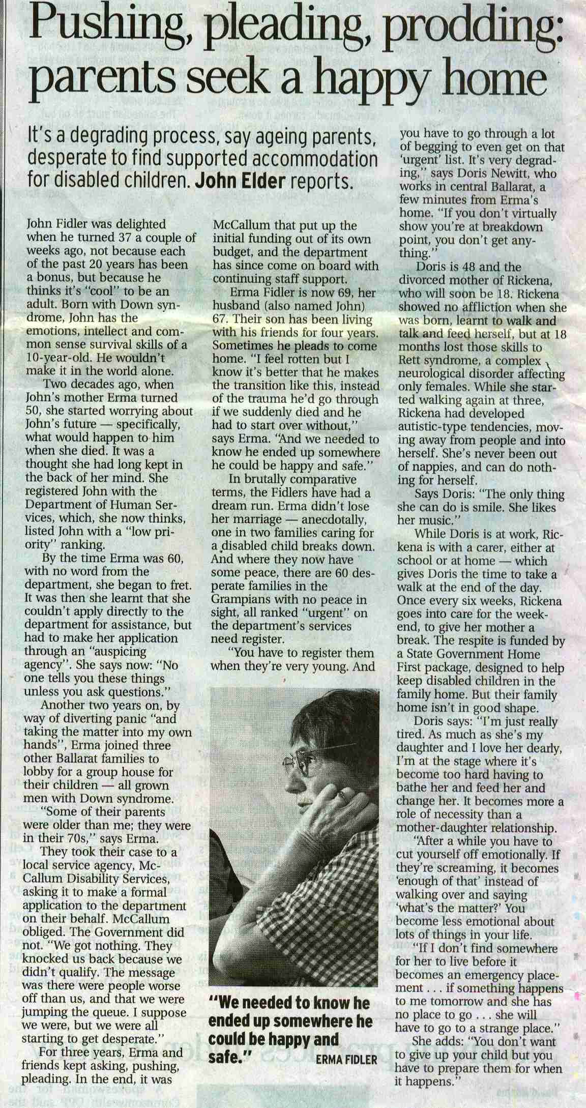 March 28 2004Congratulations on John Elder's 'Families "forced to lie" for disabled aid' (21/3) about permanent accommodation for people with disabilities. As parents of an adult with an intellectual disability, we know how difficult it is to obtain accommodation facilities. We were fortunate to have our daughter placed about five years ago but only after years of struggle and hard work.