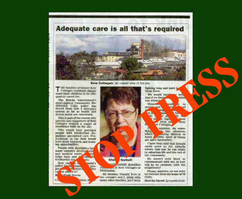 10th February 2004. Kew Cottages Parents Association passes a unanimous vote of no confidence in Minister Garbutt’s management of the Kew Cottages Redevelopment (More..)