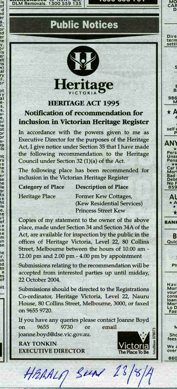 The State Government's Minister for Planning, Mary Delahunty, formerly stripped Boroondara Council of its role as the "Responsible Planning Authority" for Kew Cottages on Remembrance Day (11th November) 2003.