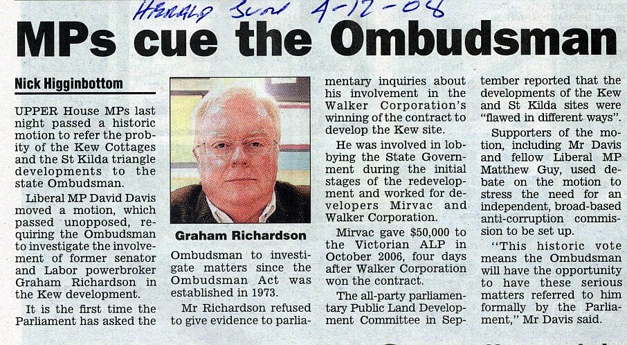 Today the Upper House of the State Parliament will debate whether the Victorian Ombudsman should investigate the Brumby Government over its St Kilda Triangle and Kew Cottages land deals ...